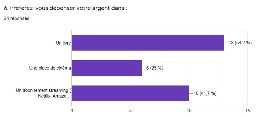 6. La majorité préfère regarder des films mais au niveau du budget le livre prime. Il est vrai que le streaming et les places de cinémas augmentent niveau prix, alors que les livres restent toujours aussi accessibles qu’auparavant.