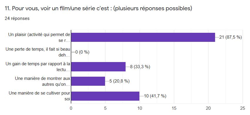 11. Tout comme les livres , regarder un film/série est un plaisir pour la vaste majorité des gens mais plus que lire un livre. Encore une fois une manière de se cultiver et notons que beaucoup de personnes pensent que c’est un gain de temps par rapport à la lecture ce qui veut dire qu’une série/film demande peut-être moins d’attention qu’un livre surtout si l’emploi du temps de la personne est chargé. Et contrairement au livre, aucune personne n’a répondu que voir un film/série était une perte de temps.