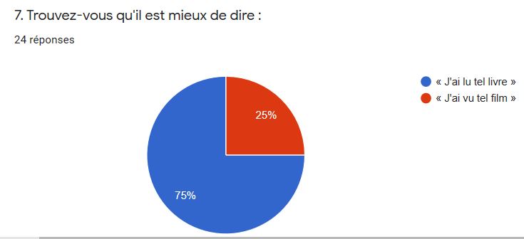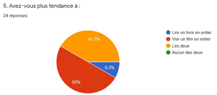 5. La majorité préfère regarder un film dans son intégralité, c’est en effet une majorité assez écrasante puisque seulement 8,3% préfère lire un livre entièrement. Le film est alors regardé dans son entièreté car il est plus rapide.