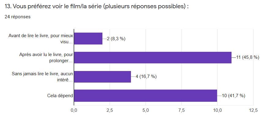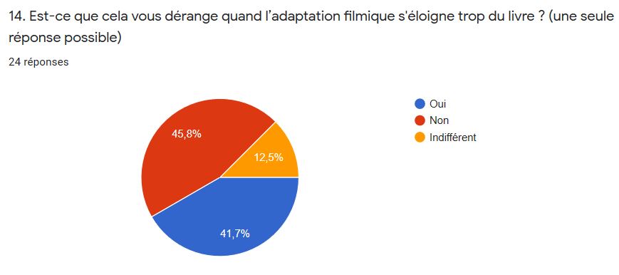 13. En revanche cette réponse, en écho à la réponse 10, montre que le livre n’a pas autant son importance que le film (analyse précédente). Le livre suscite moins de curiosité et d’intérêt lorsque son adaptation filmique existe.