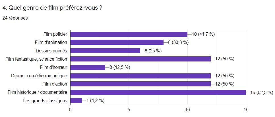 4. Ici aussi, il semble que les films documentaires/historiques soient majoritairement représentés suivis de près par les films d’actions et les drames/romances ainsi que les films de science-fiction. Ces chiffres sont assez similaires à ceux des livres ce qui veut dire que les personnes interrogées regardent les mêmes sortes de films (genre) que les livres qu’ils ont l’habitude de lire.