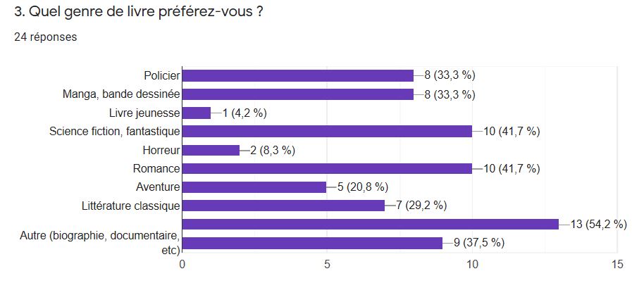 3. Nous pouvons voir que la grande majorité des gens préfère des genres de livres différents que ceux que nous avons l’habitude d’entendre parler. Finalement, il y a tout de même un grand pourcentage de gens qui aiment lire de la romance ainsi que de la SF, et autant de bandes dessinées que de romans policiers , mais peu de classiques sont représentés ici.