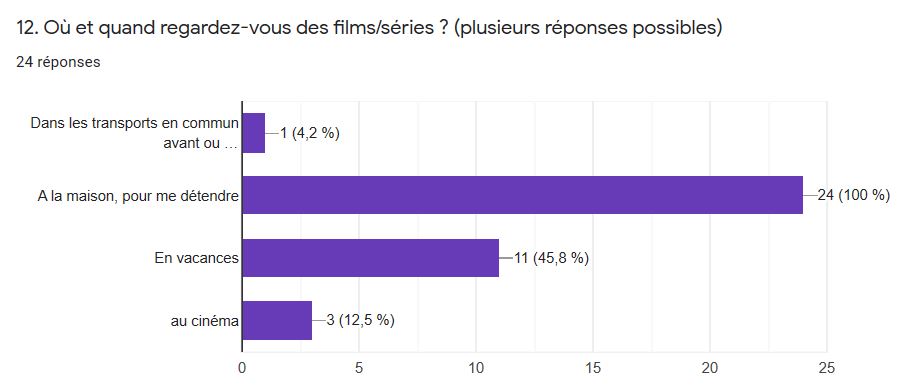 12. Dans la même lignée que les livres, toutes les personnes sondées regardent des films/séries chez eux pour se détendre et la même quantité de gens regardent les films et lisent des livres pendant leurs vacances. Et un petit nombre va voir des films au cinéma ; cela peut-être expliqué par la question du prix de la place qui revient chère.