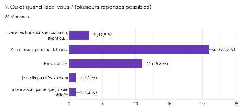 9. La vaste majorité de répondants lisent chez eux , pour se détendre, et un plus petit pourcentage lit aussi pendant les vacances. Pour finir, seulement une personne a avouée être obligée de lire, probablement dans le cadre de ses études.